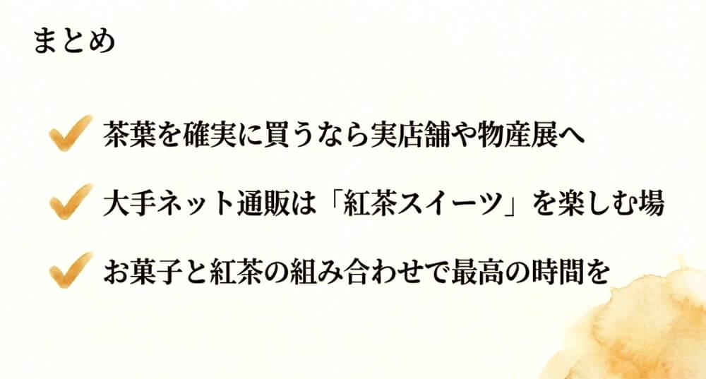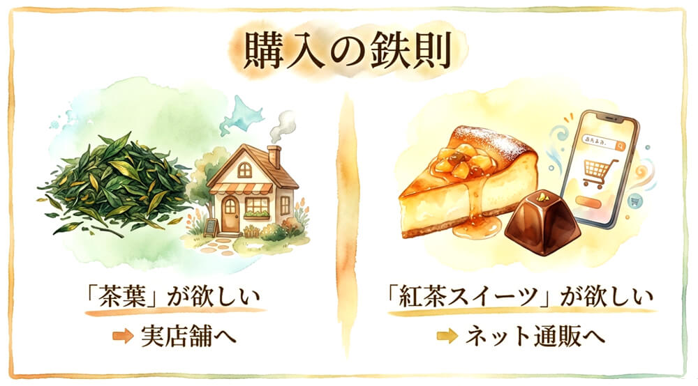 【結論】茶葉を確実に買えるのは「実店舗」。通販なら「紅茶スイーツ」一択!